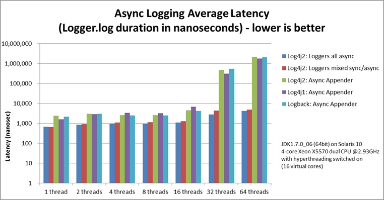 The graph below compares the throughput of synchronous loggers, asynchronous appenders and asynchronous loggers. This is the total throughput of all threads together. In the test with 64 threads, asynchronous loggers are 12 times faster than asynchronous appenders, and 68 times faster than synchronous loggers.